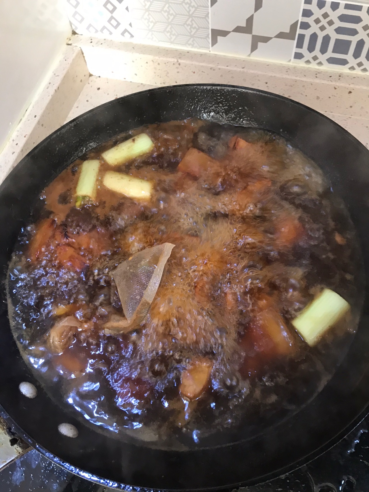 辅料:调味料老抽、盐、料酒、蚝油、鸡精适量、调味料香叶、花椒、桂皮、冰糖、调味料生姜、香葱