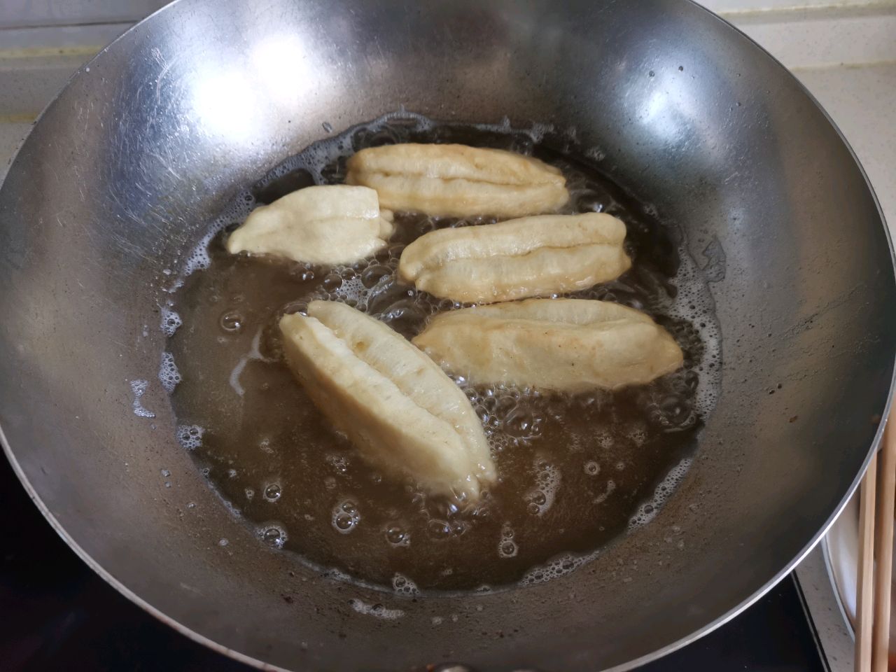 步骤5、油温五成热,下锅,待油条浮起,用筷子不断翻转,让油条均匀受热。