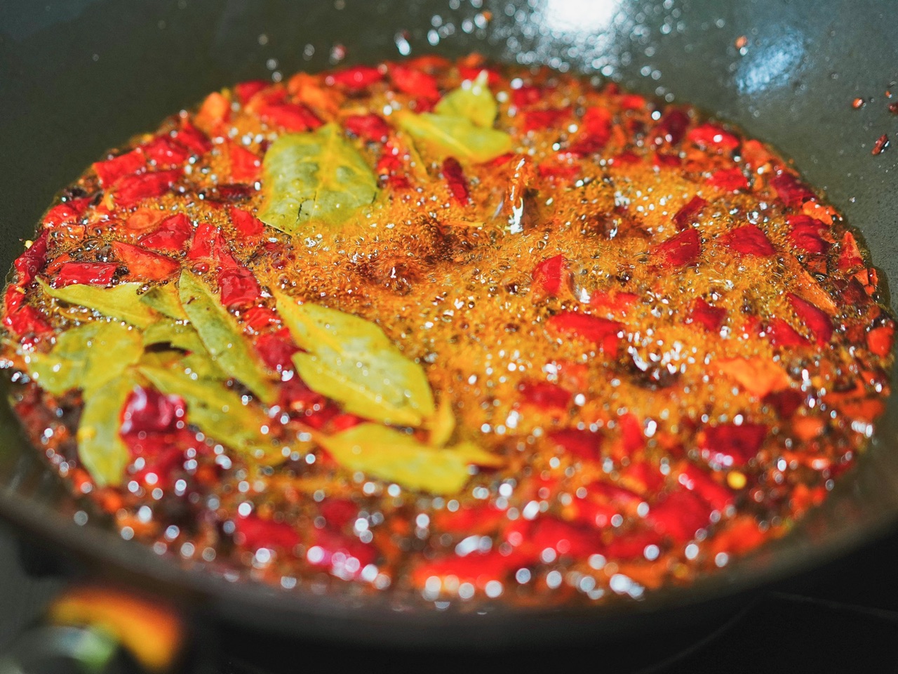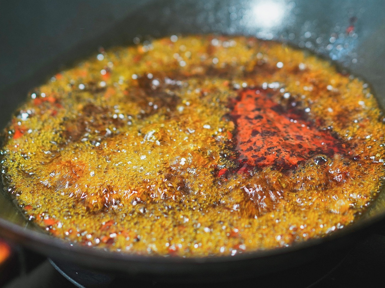 步骤3、热锅冷宽油,放入火锅底料爆香。