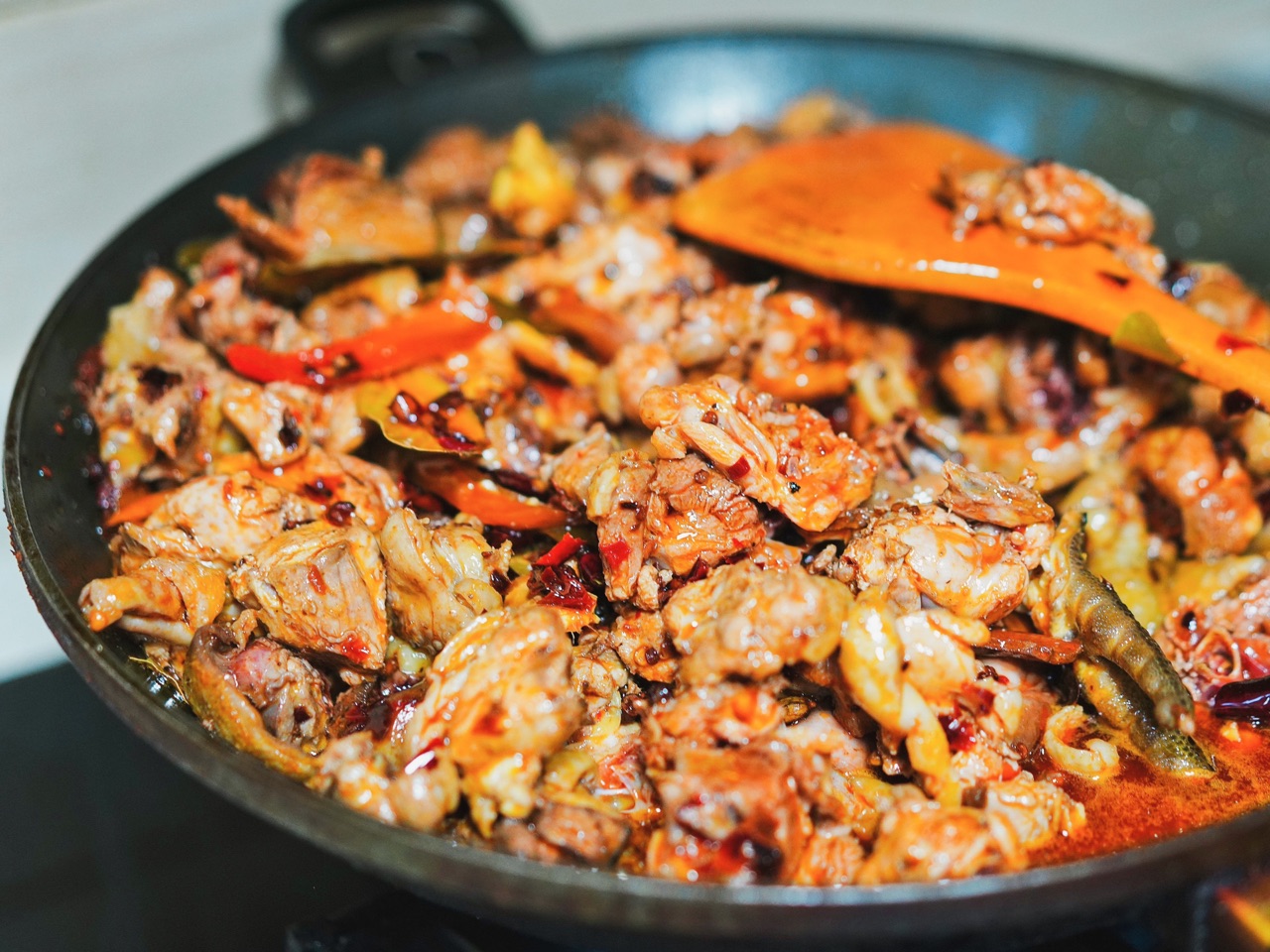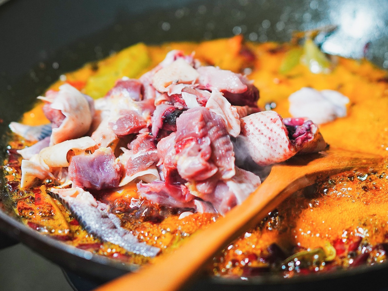 步骤6、中小火将鸡块翻炒至半熟。