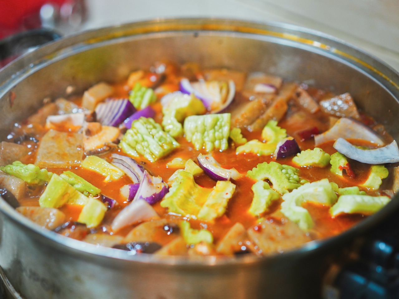 步骤8、煮10分钟左右,放入苦瓜、洋葱、青豆米。