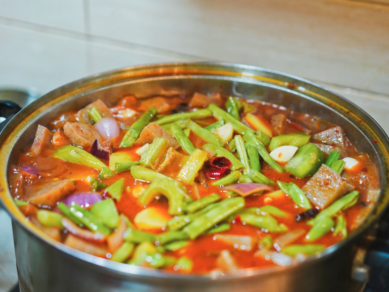 辅料:【辅料】、土豆3个、洋葱1个、苦瓜1根、香菇8朵、青豆米500克、四季豆250克、莴笋1根、魔芋500克、【泡菜】、四川泡生姜2根、四川泡辣椒3根、【香料】、八角3个、山奈2个、香叶10片、花椒适量、干辣椒1把、老姜1块