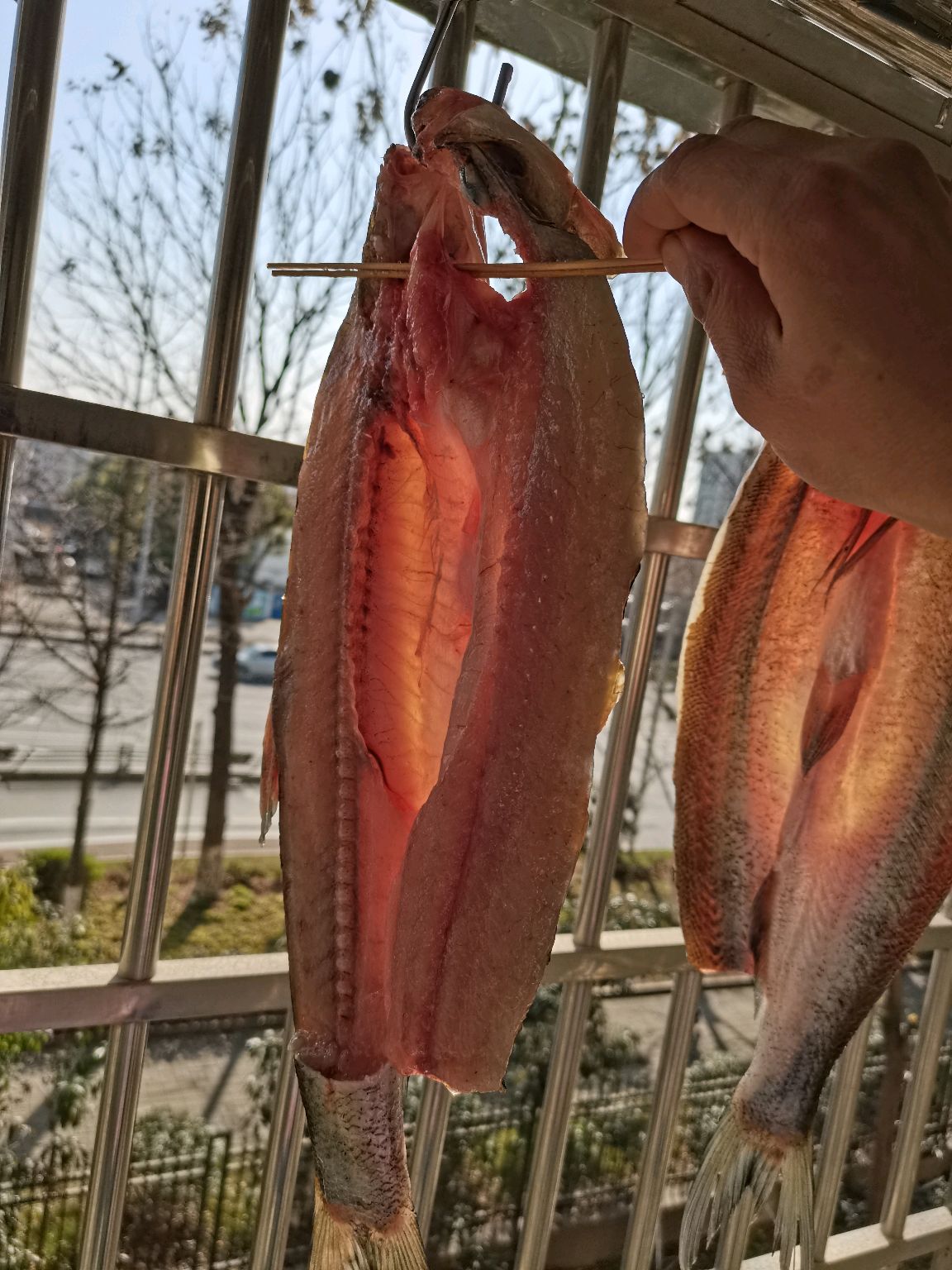 步骤7、鱼头上穿上筷子或竹签,用钩子钩在鱼嘴上挂起来晒太阳