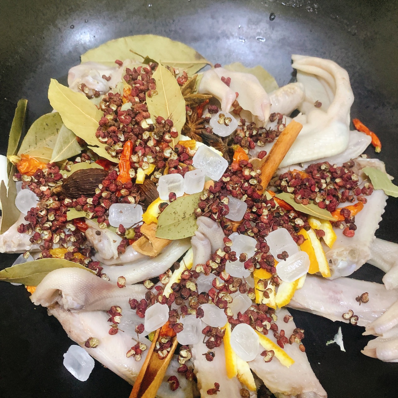 步骤2、准备好大料香叶辣椒花椒桂皮八角冰糖橙皮炒果