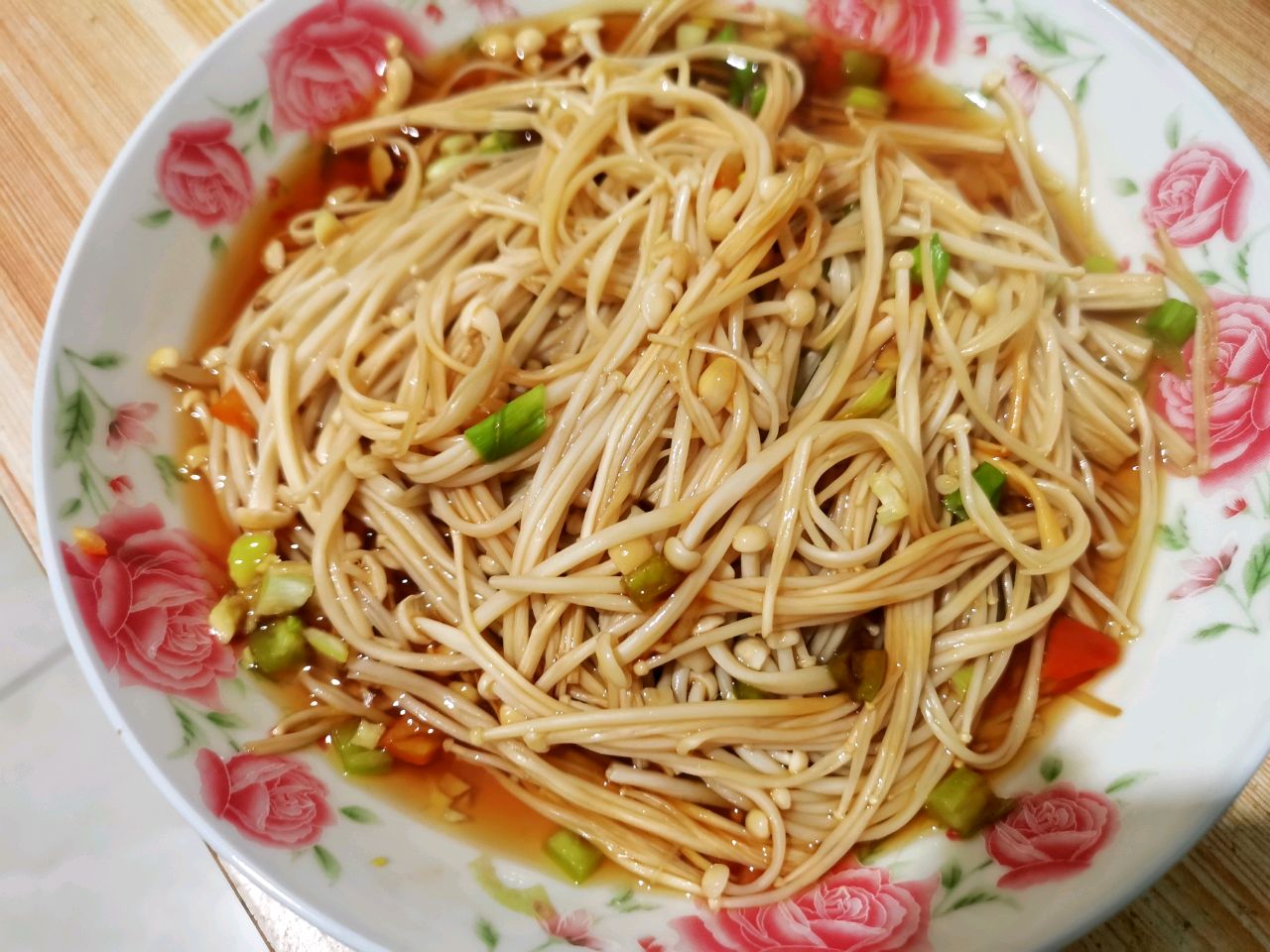 步骤3、把金针菇摆在盘子上,撒上葱、蒜、青红椒,加入适量盐、少许糖、适量生抽和耗油以及少许鸡精