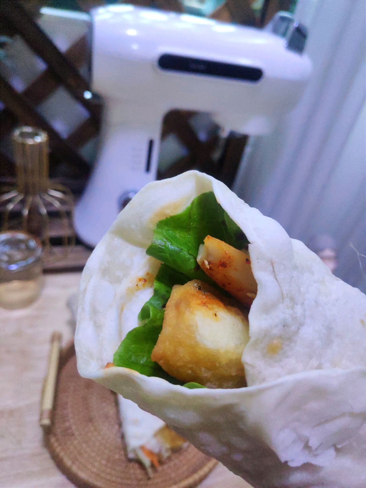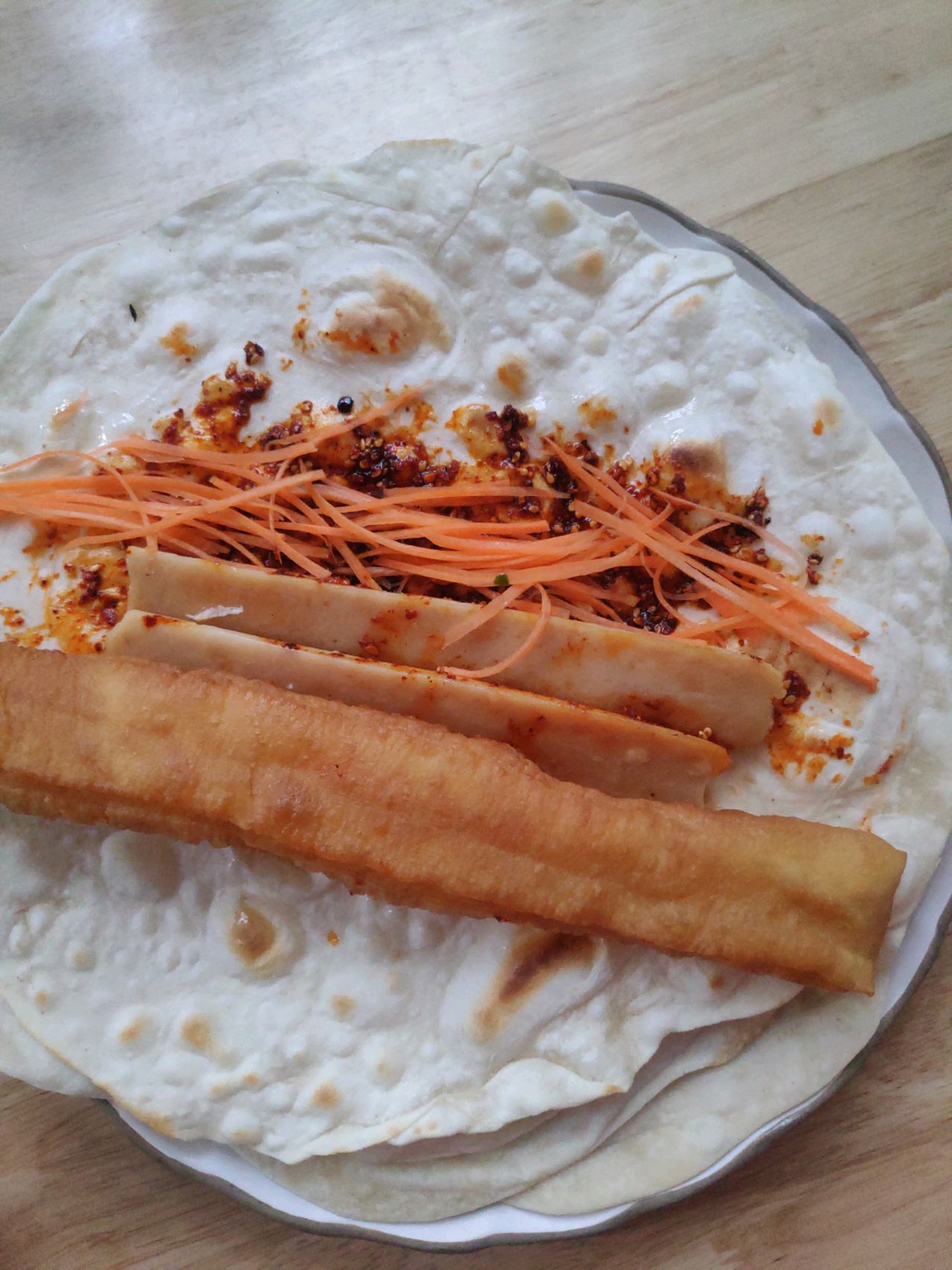 步骤7、喜欢吃什么就加什么,我放了半根油条,生菜和其他的,再来一勺辣椒油,味道真心不错