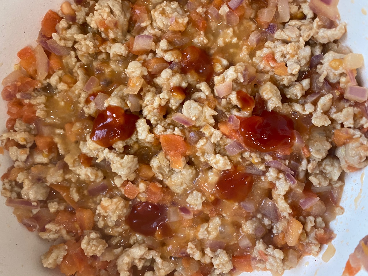 步骤5、加入西红柿丁,加入番茄酱,再炒