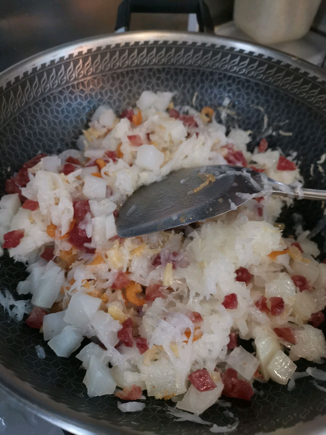 步骤6、蘿蔔熟透,會有一些蘿蔔汁,如果湯汁幹了,可以加一點點瑤柱水。轉最小火,將瑤柱、蝦米、臘肉丁、胡椒粉、糖、鹽、雞粉,都放進去攪拌均勻。