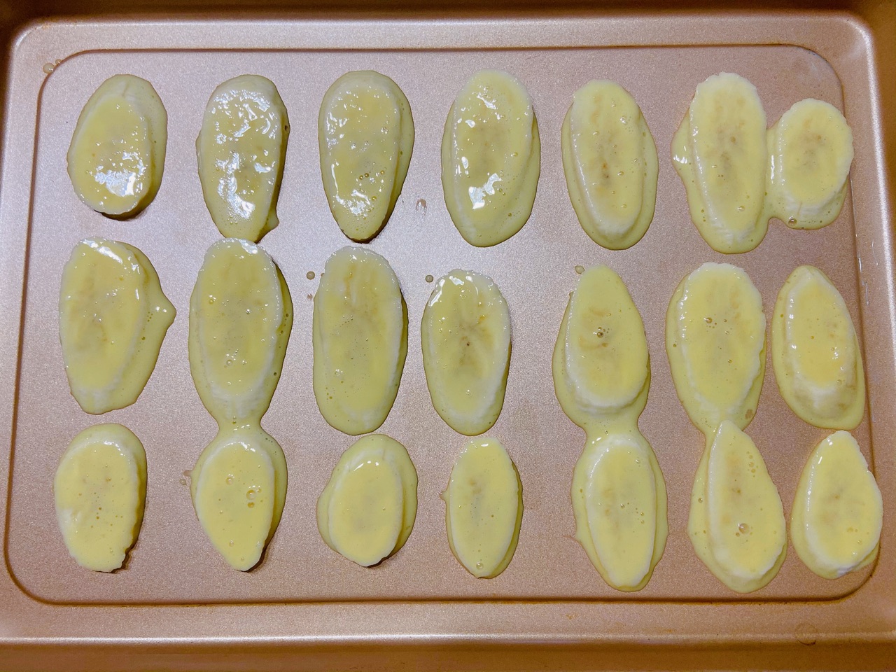 步骤2、香蕉斜着切片,个人感觉切大一点好看,也可以竖着切圆形片,把香蕉片放入碗中两面都充分裹上蛋液,放入烤盘中,表面撒上白糖会更脆哦。