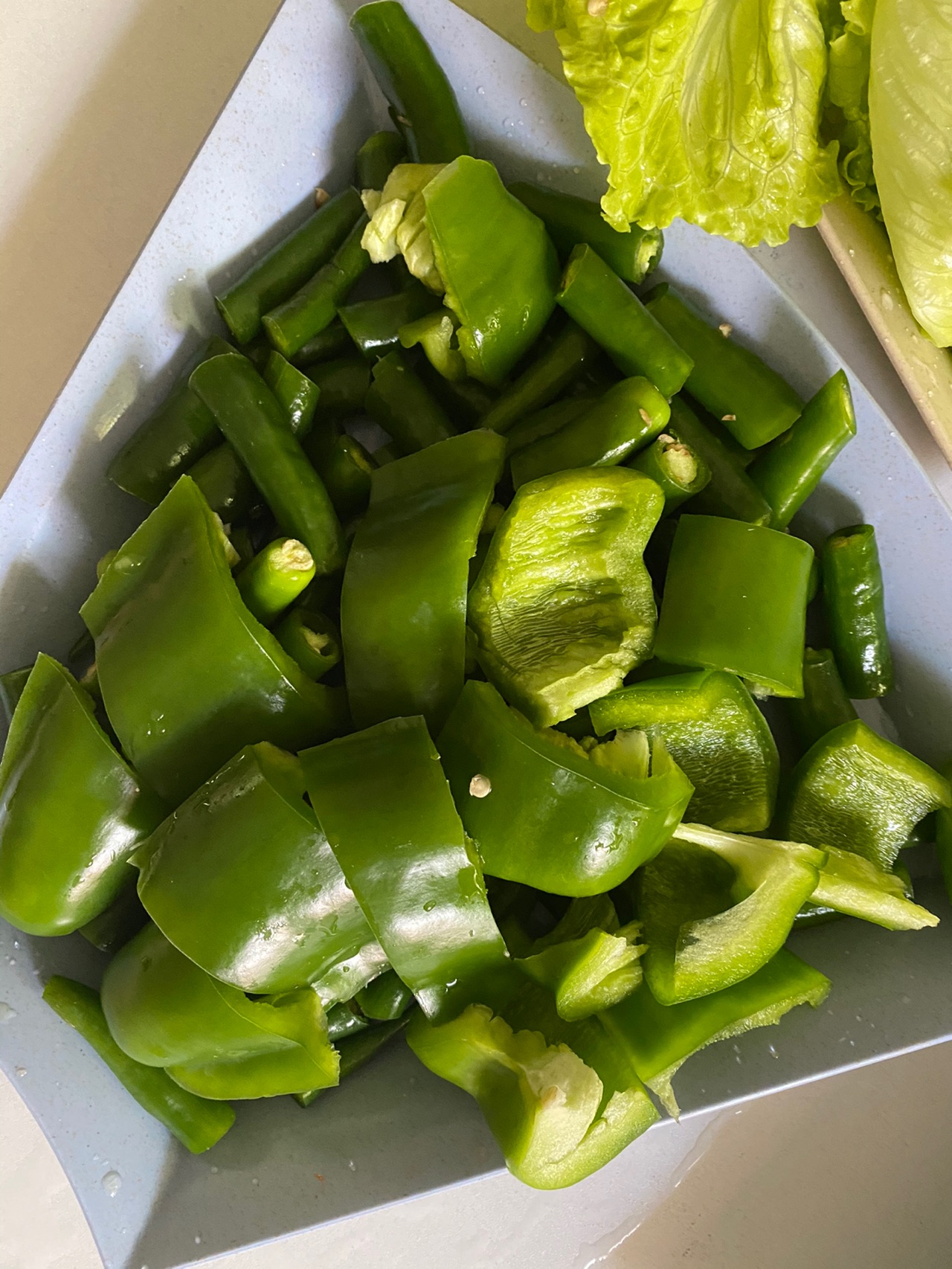 辅料:葱两根、姜5片、干辣椒段4把、花生100克、火锅底料半袋、水果椒1个、青椒1把、蒜10瓣