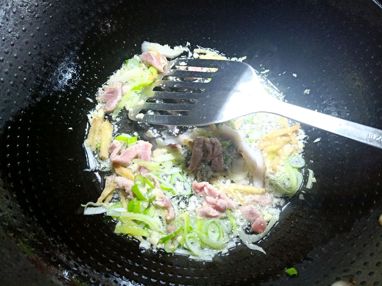 步骤3、起锅热油小火下入葱丝、姜丝、蒜末、肉丝爆香炒熟。