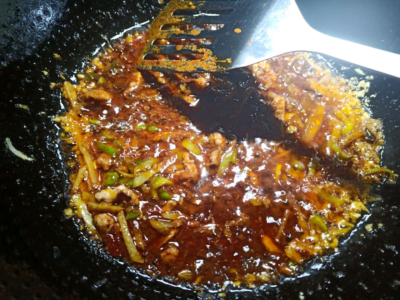 步骤7、将调好的B袋料水倒入豆腐,翻炒均匀,大火稍微收下汁。