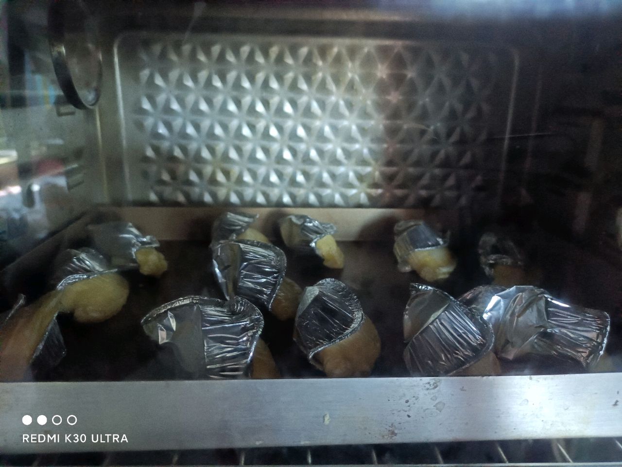 步骤5、把锡纸取下来,220再烤5分钟左右,如果想要好看点,这时可以刷鸡蛋液,蘸点黑芝麻,我家都不爱吃黑芝麻,这步就省略了