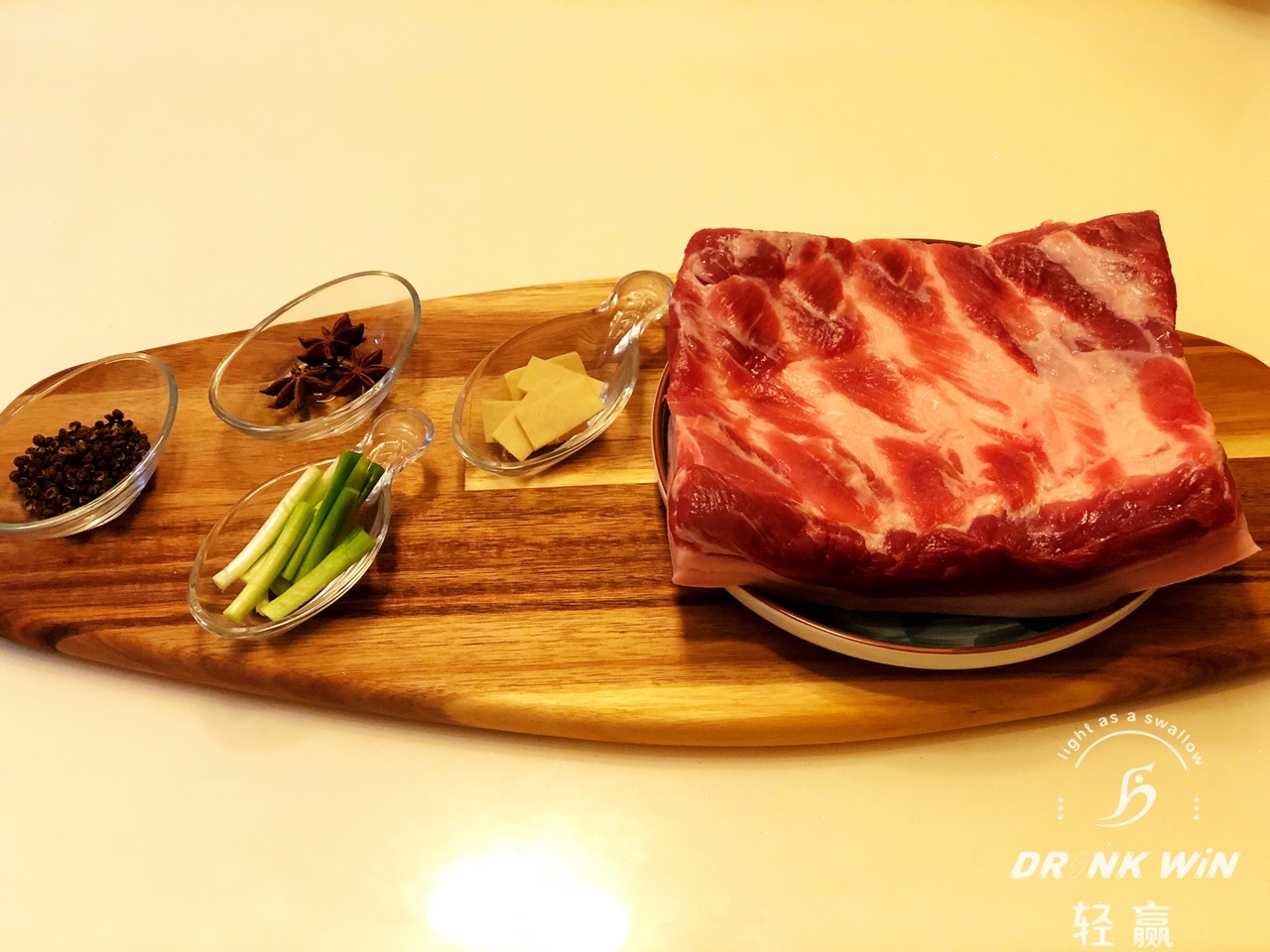 步骤1、【食材准备】五花肉1000克、生姜五片、葱白10段、大料三个、花椒5克