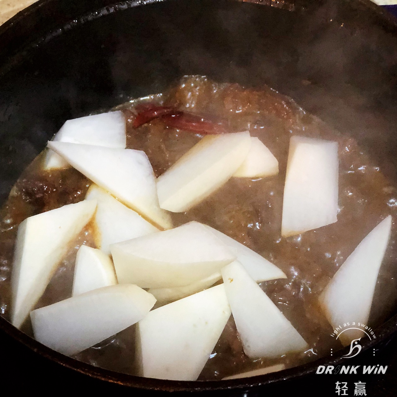 步骤6、慢煮后,用筷子轻搓牛肉,软烂即放入白萝卜。小火焖煮20分钟。煮好后,大火收汁。