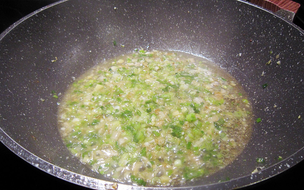步骤11、锅置炉上升大火,锅热放底油,加入剁碎了的炝锅材料,再勺入锅汁用的的姜碎和葱白碎一起炝锅;