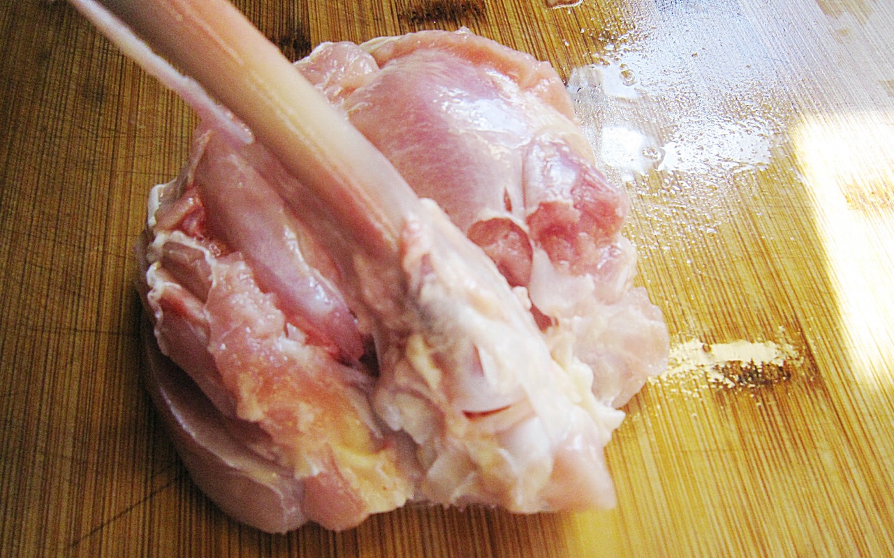 步骤3、在棒槌粗的那端把周围的肉割开把骨头取下来;
