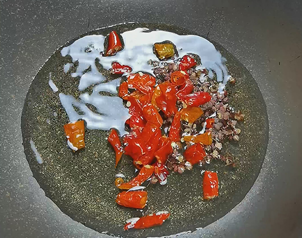 步骤7、锅里倒油,小火把花椒辣椒炒香备用。