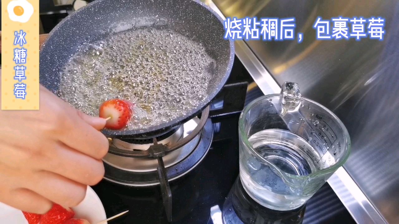 步骤15、糖浆包裹一圈草莓后,迅速放入冰水冷却,就算完成啦