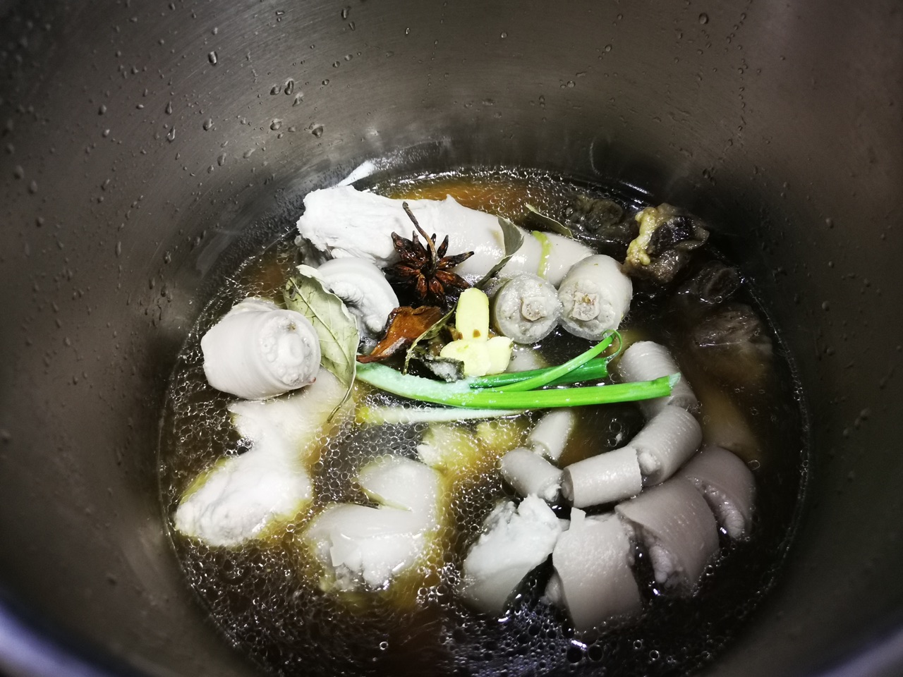 步骤3、放入高压锅把大料一起倒进去加5勺黄豆酱和5勺白酒加入适量的水(不要没过猪尾巴)开火煮10-15分钟即可!喜欢吃辣的朋友可以加辣椒一起煮