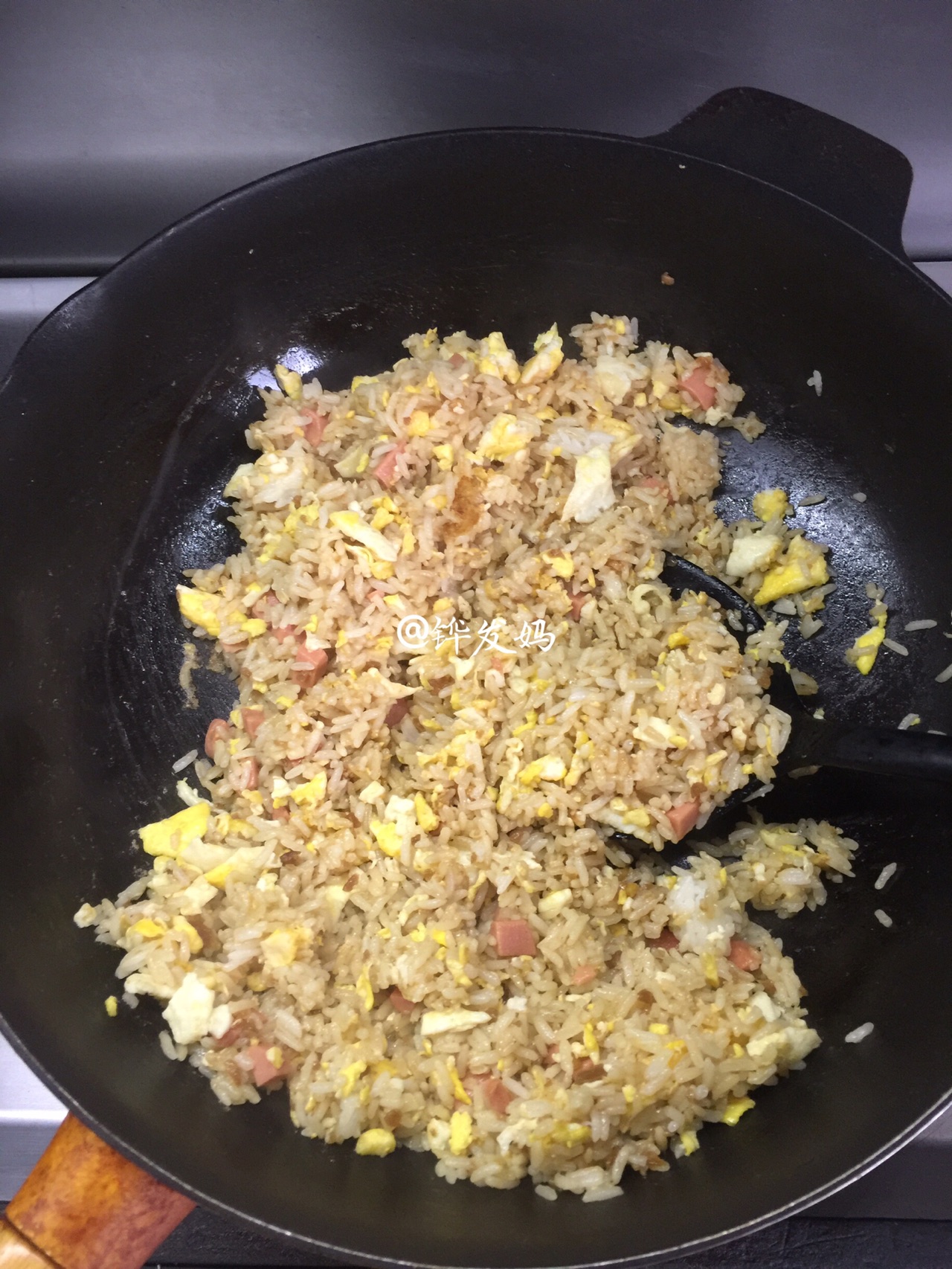 步骤5、放入切碎的火腿肠丁、菜脯丁,米饭