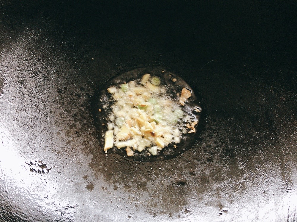 步骤6、锅烧热油,加入姜末、葱白爆炒出香味。