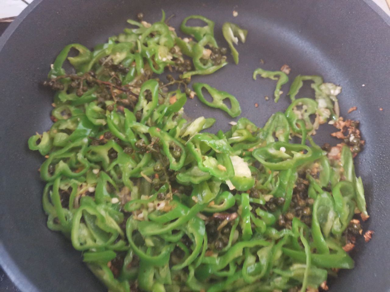 步骤6、热油,放蒜蓉,姜丝,青椒,青花椒炒香