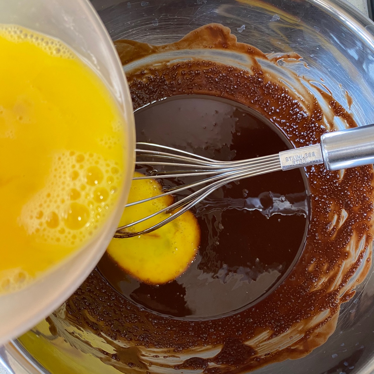 步骤2、黄油+黑巧克力隔热水融化搅拌均匀;加入绵白糖搅拌均匀;