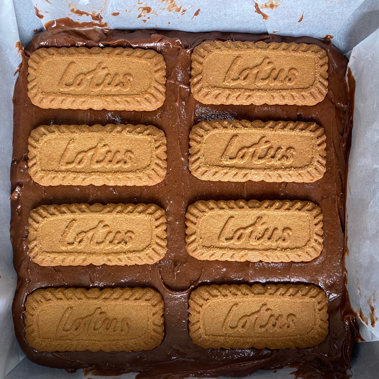 步骤5、装入垫好油纸的膜具抹平,铺上焦糖饼干轻轻压平,这个配方量可以做8块,放入已经预热好的烤箱170度15~20分钟;