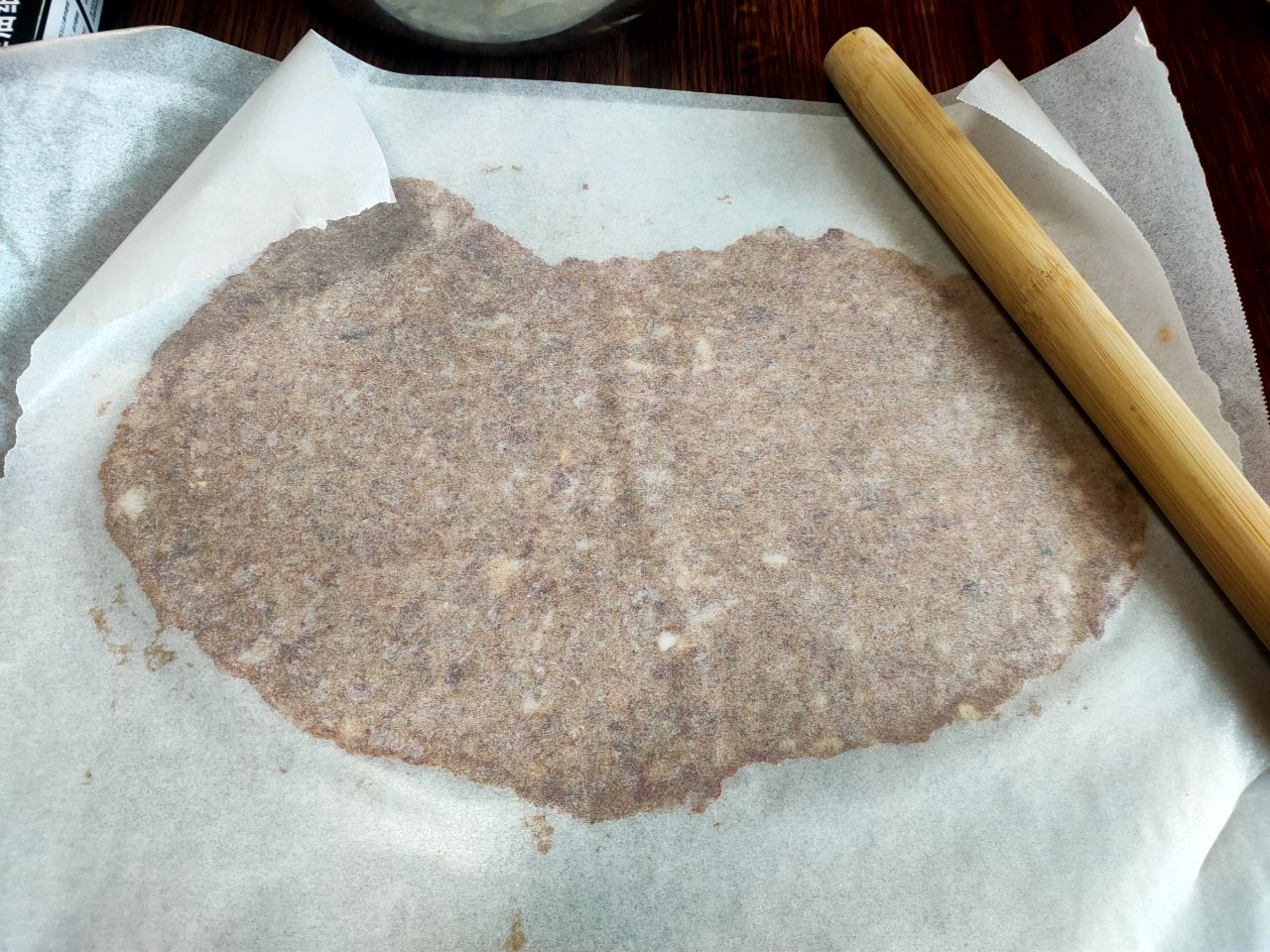 步骤2、桌上垫油纸,放两大勺猪肉,在猪肉表面盖上油纸,用擀面杖擀成厚薄3cm左右,与烤盘大小差不多的薄肉饼。