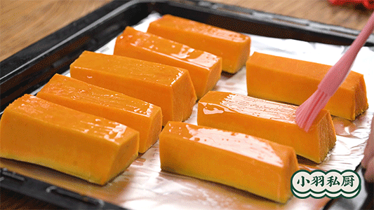 步骤1、南瓜带皮切成大块儿放到烤盘里,表面刷上一层油,放进烤箱230度上下火烤25分钟。