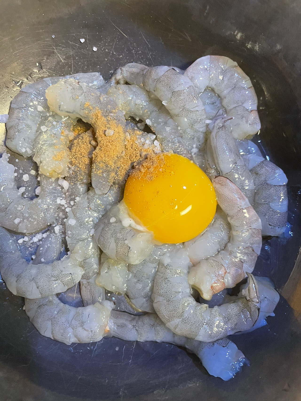 步骤1、虾,去壳,去虾线。加入料酒,生姜,葱白,腌制十分钟,控干水。