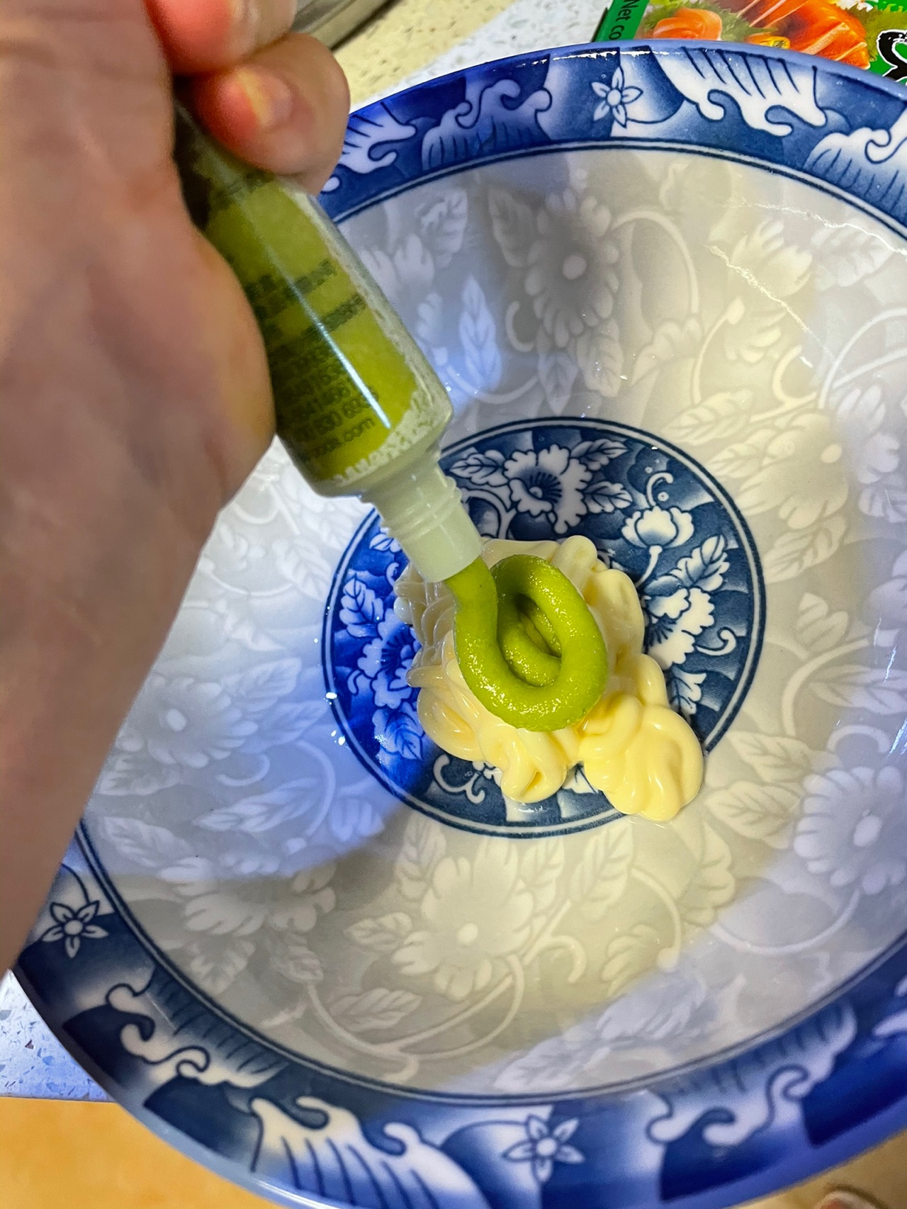 步骤4、沙拉酱加芥末。芥末看各自口味用量。调匀,将炸好的虾加进去搅拌均匀。