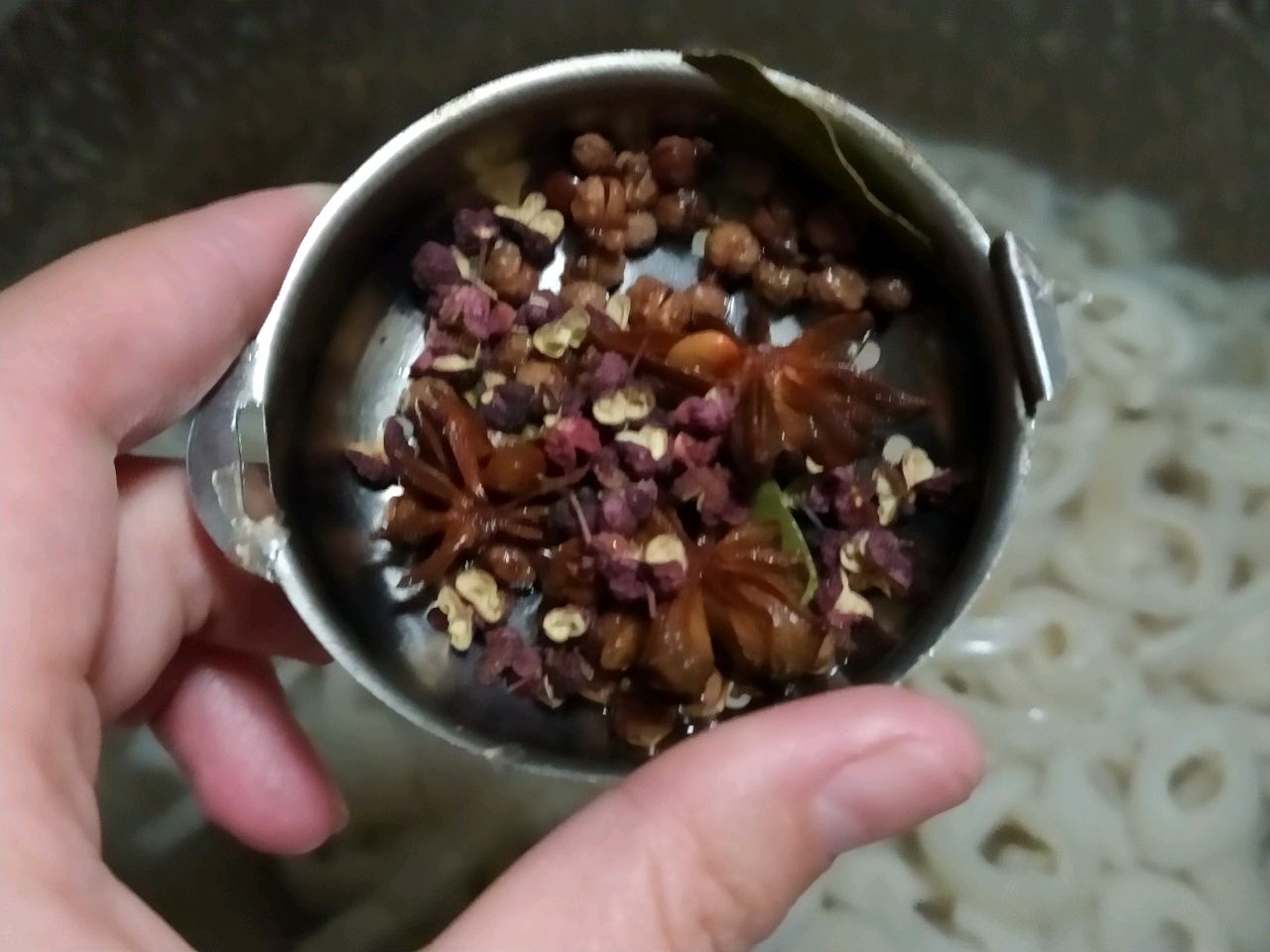 步骤4、准备一下炖制肉皮冻的香料:八角3颗,花椒十几粒,香叶两片,放在炖肉盒中。