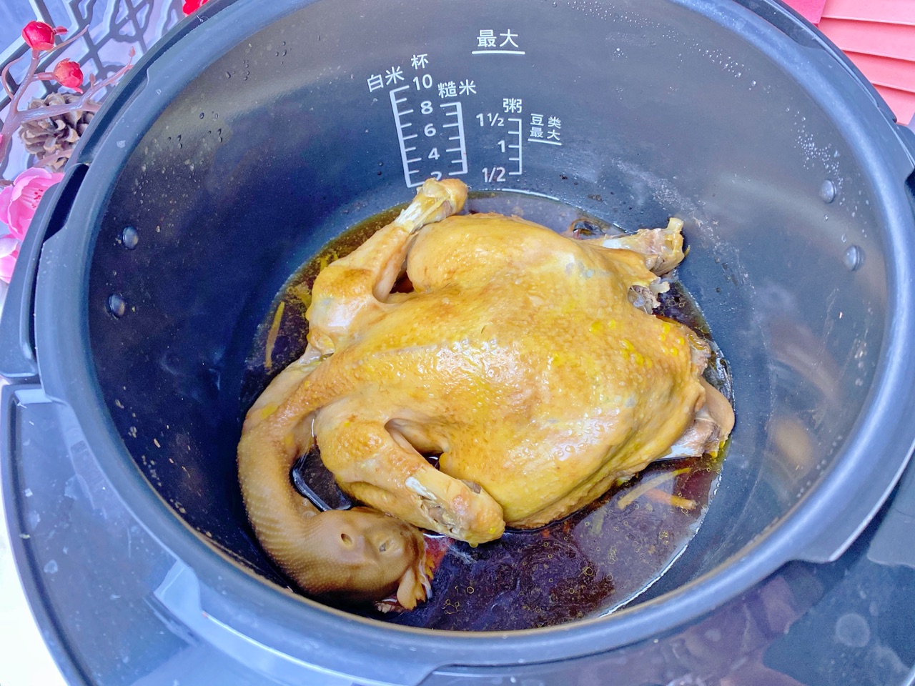 步骤7、时间到排气后打开锅盖,已经传来阵阵香味,鸡已经非常酥烂了!