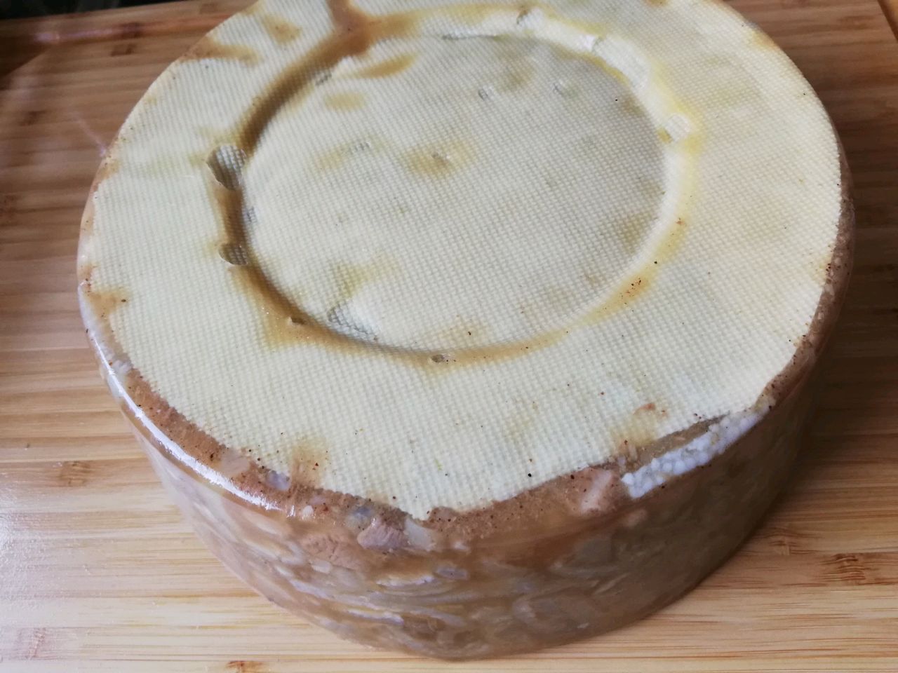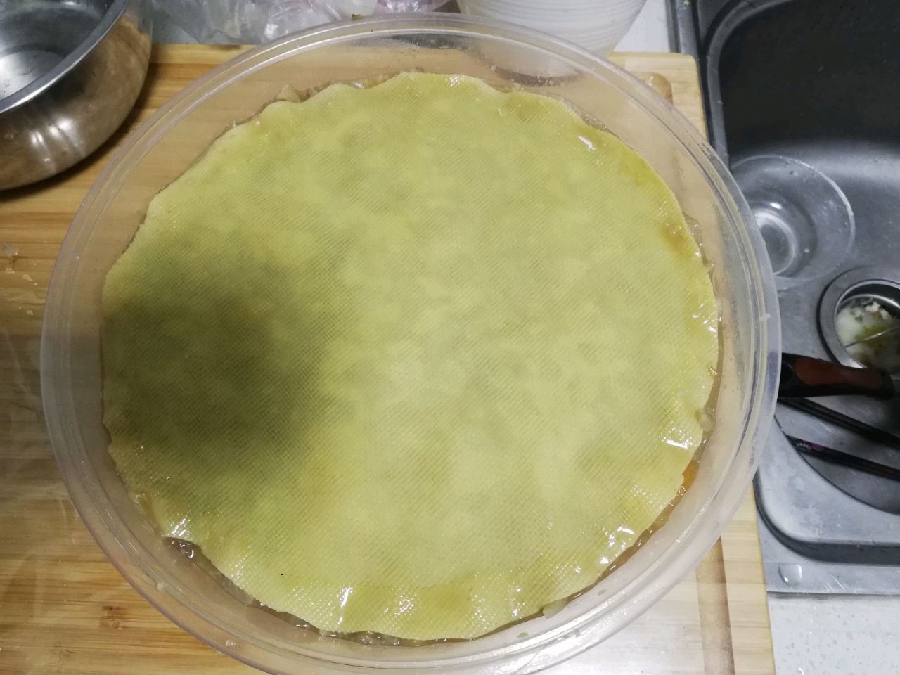步骤11、买的豆皮按照大号餐盒的形状裁两个圆,一张铺底