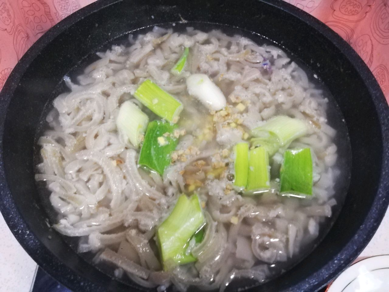 步骤3、切好的猪皮下锅加水没过猪皮即可,加入姜末葱段开煮。