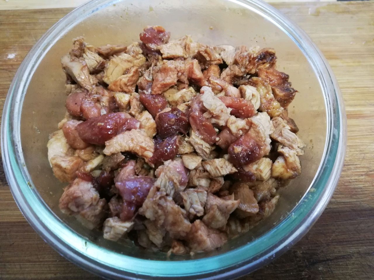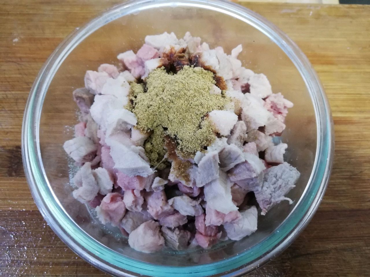 步骤5、煮猪皮的过程中把飞过水前腿肉切成小丁,加入适量盐、鸡精、十三香、老抽、生抽腌制。