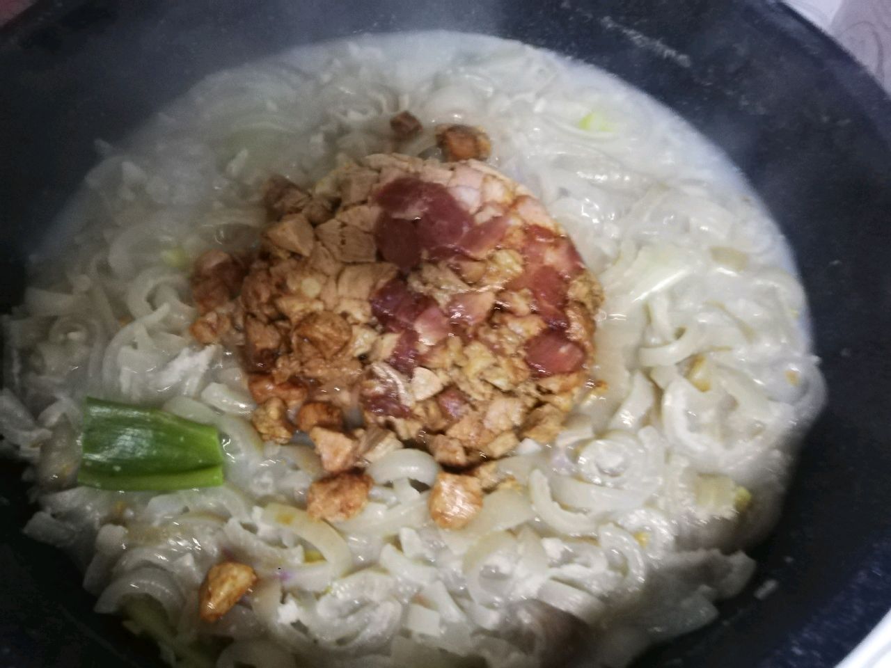 步骤8、猪皮煮50分钟时倒入腌好的肉丁,