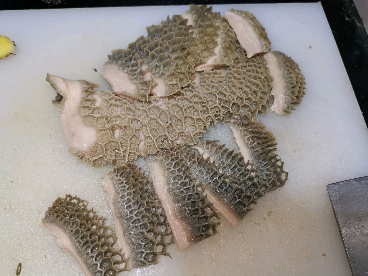 步骤5、将牛肚反过来,用刀去除油脂和筋膜。至此牛肚就处理好了。接下来进入调理阶段