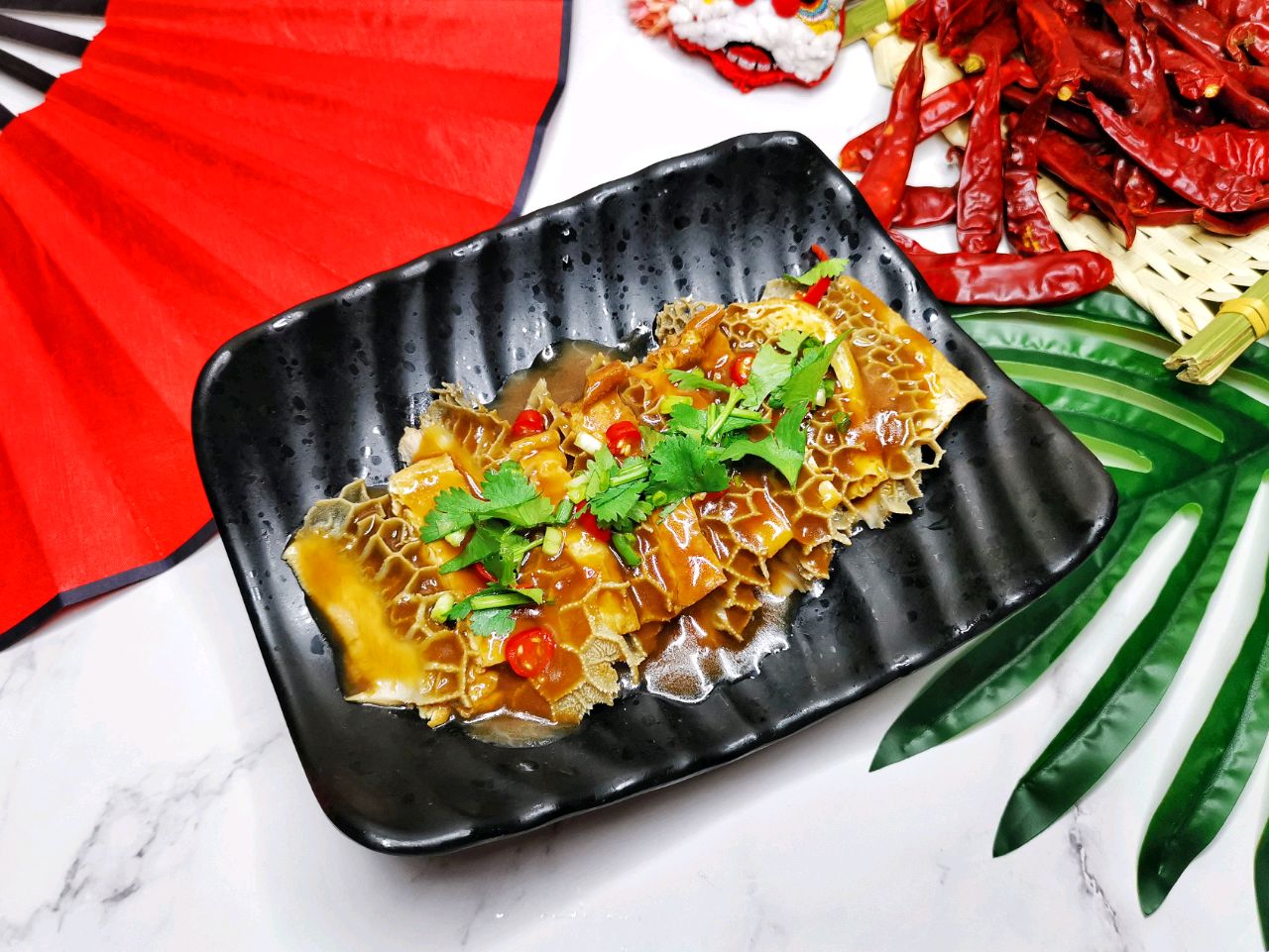 步骤21、然后一片豆腐一片牛肚堆叠起来摆入盘中,撒上切好的小米辣,接下来我们调制一个酱汁