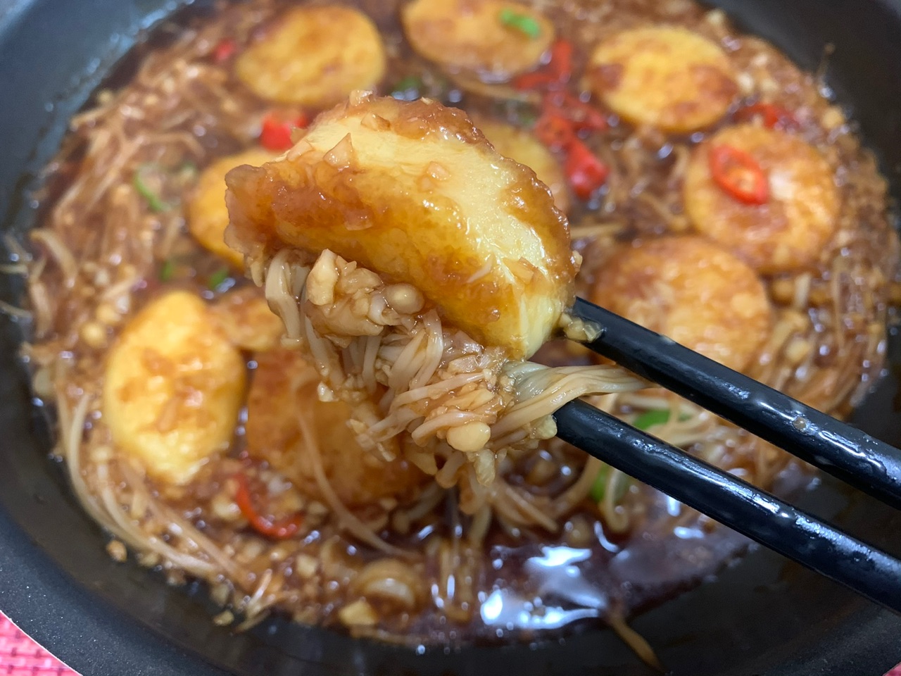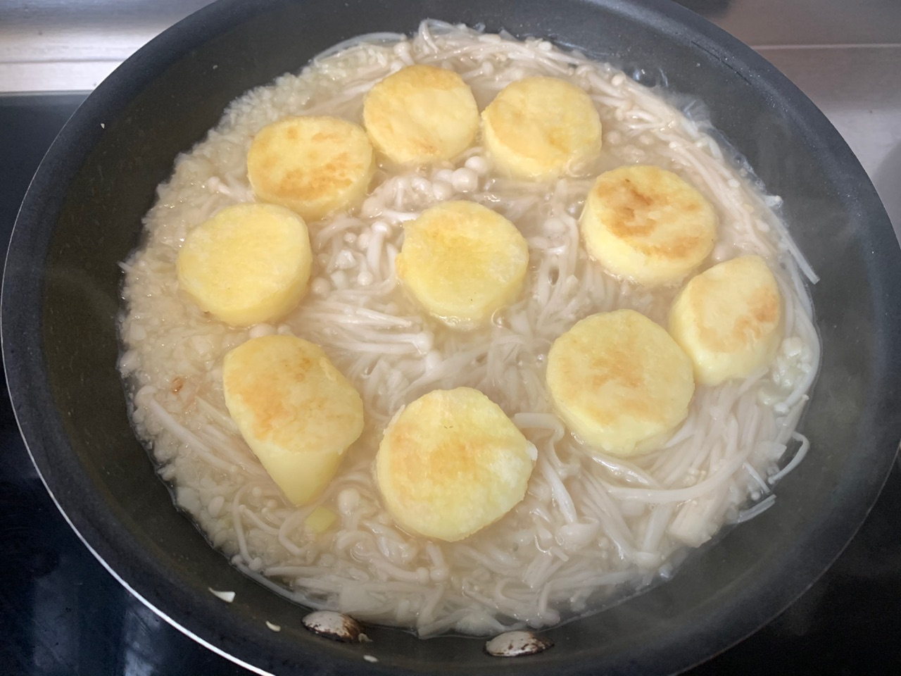 步骤5、金针菇炒软后把日本豆腐放在金针菇上