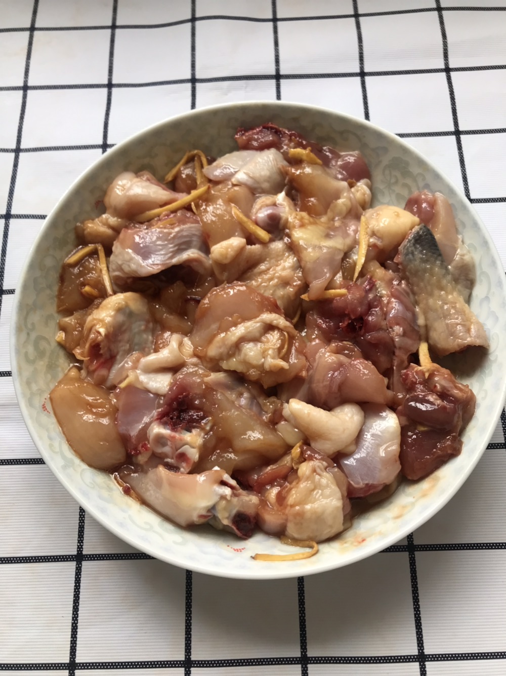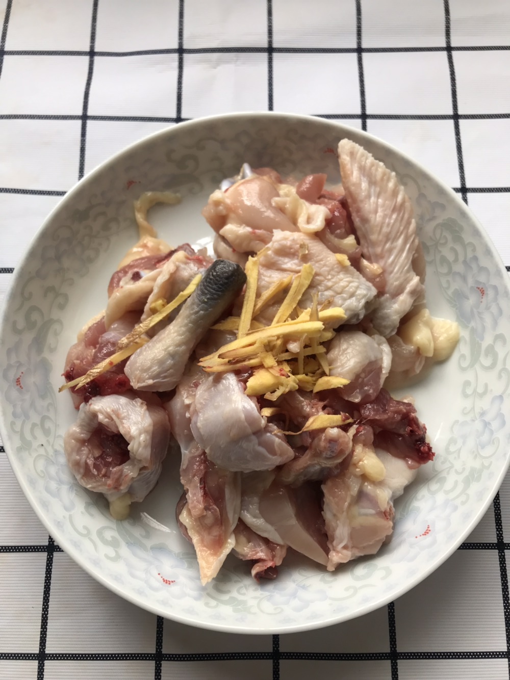 步骤1、鸡腿肉洗净剁小块,切上姜丝备用。