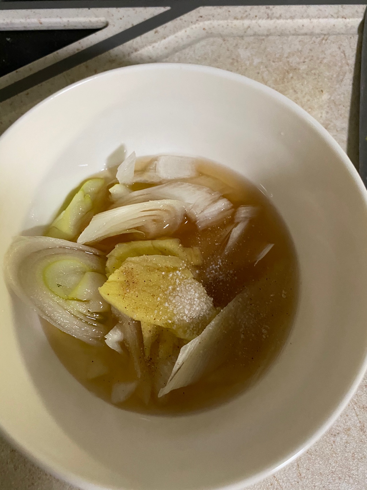 步骤2、备好的葱姜加入料酒、白胡椒粉和盐做成葱姜水