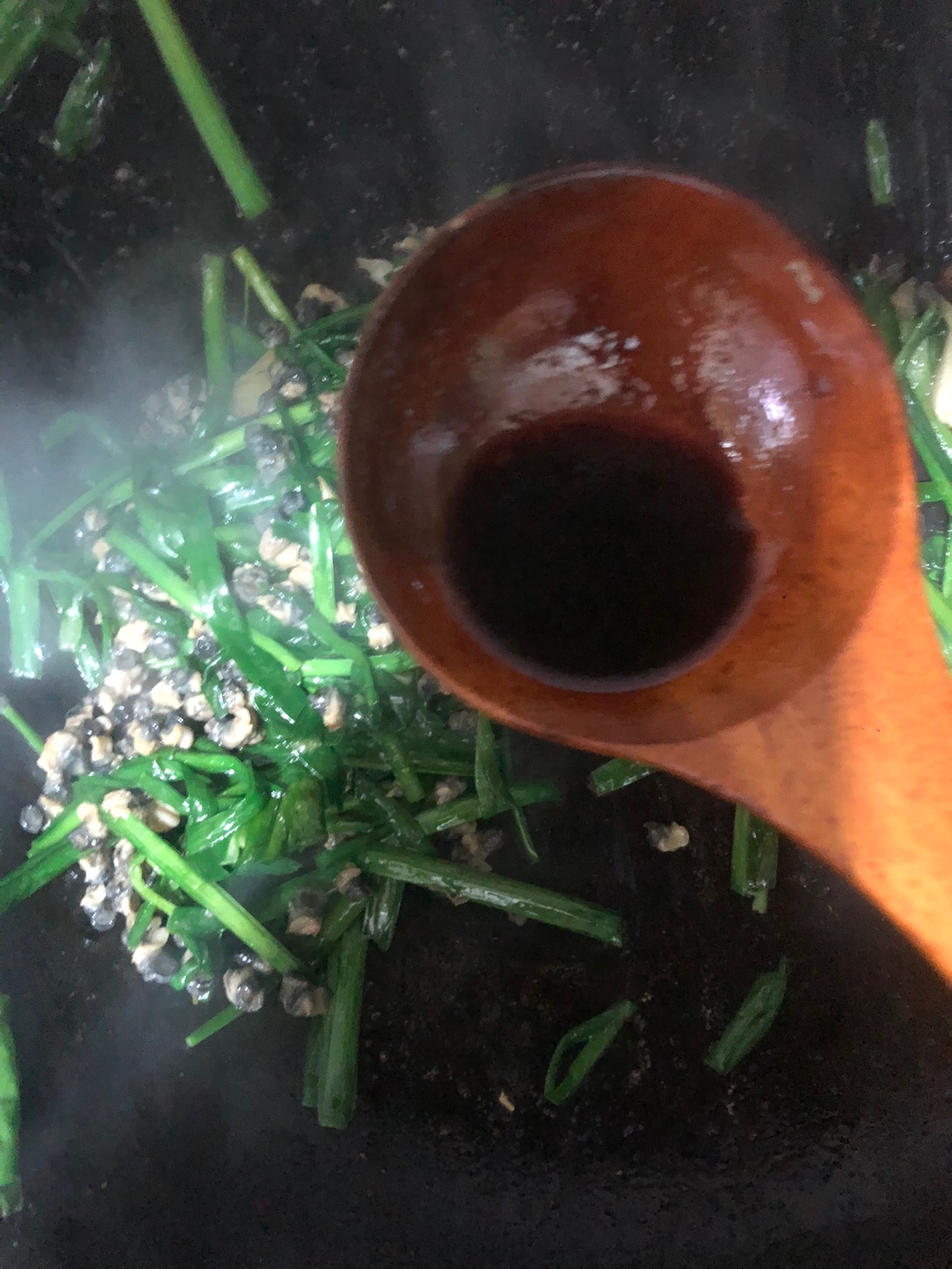 步骤7、下韭菜根炒一下下入焯好水的螺肉