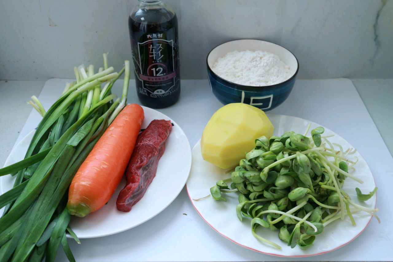 辅料:韭菜1把、豆芽100g、猪瘦肉100g、土豆1个、六月鲜轻盐牡蛎酱油1勺、盐3克