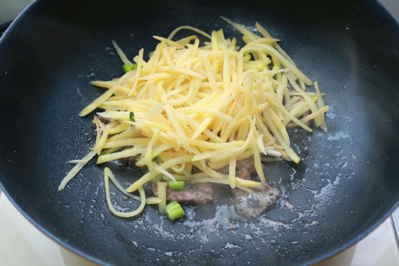 步骤13、土豆丝淘洗干净后放入锅中翻炒几下。