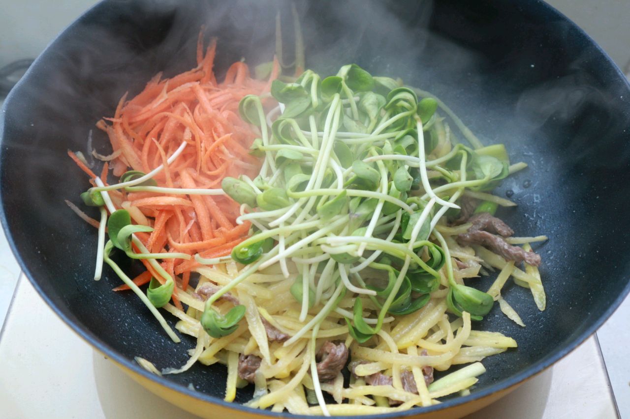 步骤14、在把胡萝卜丝,豆芽放入锅中。