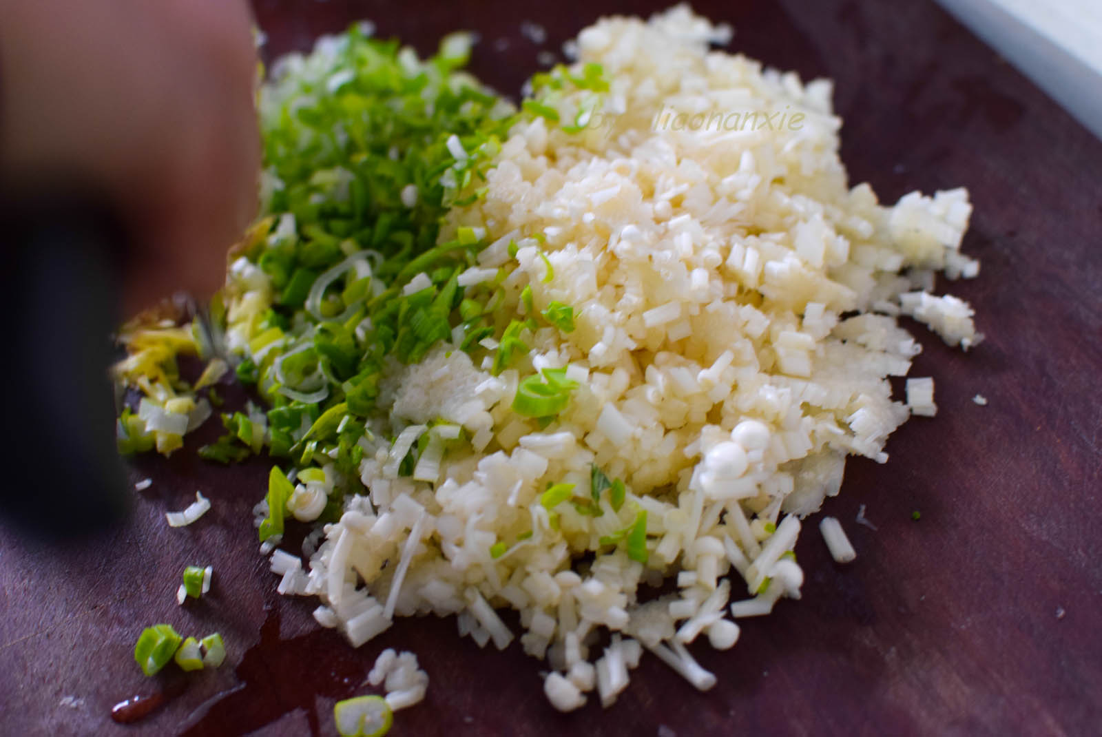 步骤3、蒜黄、金针菇、韭菜切碎,其中韭菜的用量最大,蒜黄一小把,金针菇一大把。