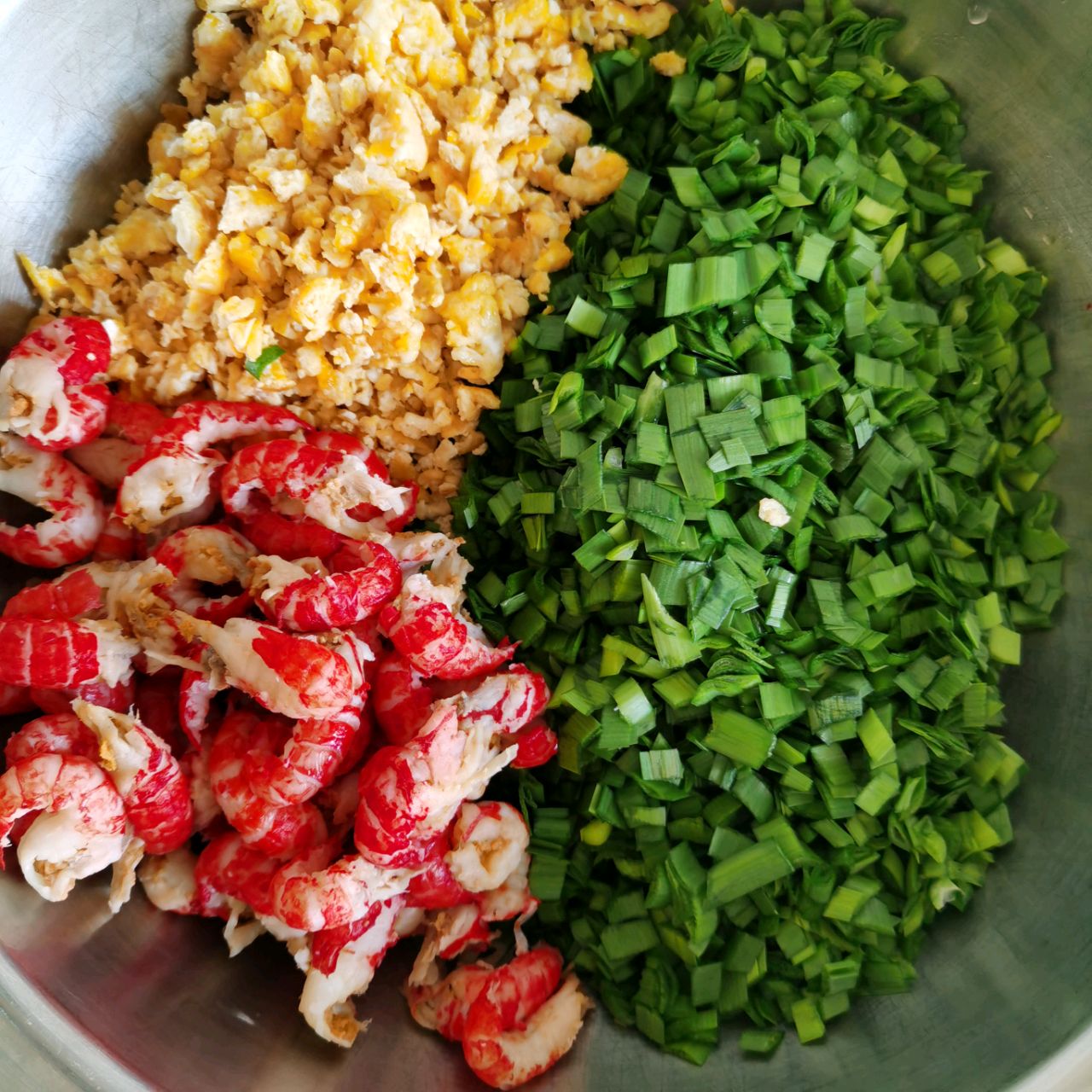 步骤1、龙虾尾去壳,攥净水,鸡蛋煎好,韭菜洗净切成小块